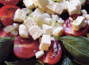- Impiattate le porzioni con il coppapasta alternando uno strato di verdure e uno di feta sbriciolata. Finite con la feta e decorate con il basilico e la menta.