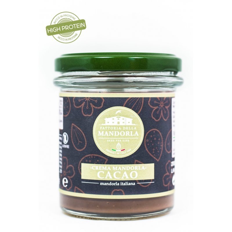 Crema spalmabile di mandorla pelata tostata al cacao amaro, in vaso di vetro plastic-free da 150g.