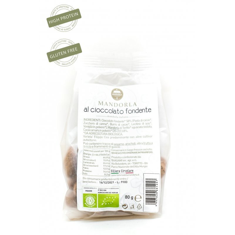 Snack dolce a base di mandorla bio pugliese ricoperto di cioccolato fondente.