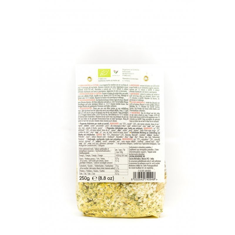 Riso*, carciofi*, sale marino, farina di riso*, cipolla*, sedano*, carota*, prezzemolo*, porro*, olio extravergine d'oliva*, aglio*, amido di mais*, miso* (soia*, riso*, acqua, sale, koji), estratto di lievito, spezie*. *=BIOLOGICO